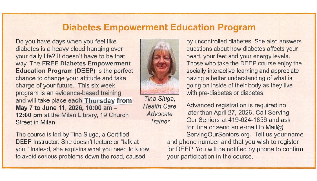 • MEDICARE CLASS,  May 13, and June 10, 2026, 12pm noon to 1:00 p.m., Medicare Lunch & Learn. No appointment necessary. Pack your lunch and drop in with your Medicare questions. Location – Serving Our Seniors, 310 E. Boalt Street, Sandusky.